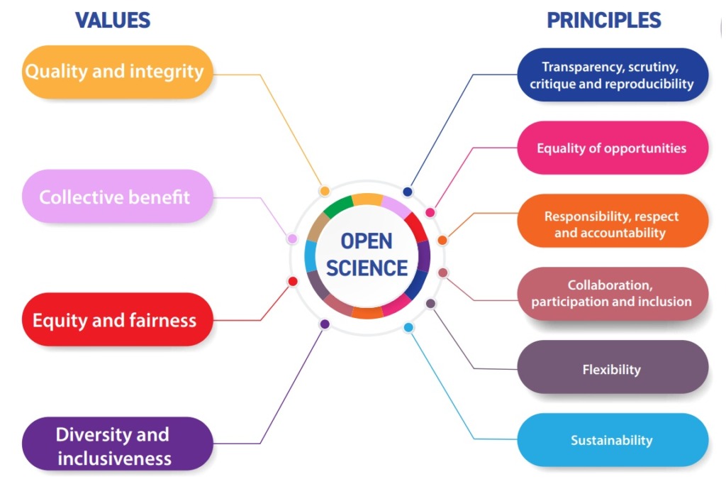 - Responsibility, respect and accountability – increasing openness in science requires greater responsibility from all open science actors, grounded in public accountability, ethical awareness, integrity, and consideration of social and ecological impacts, forming the foundation for good governance of open science.
