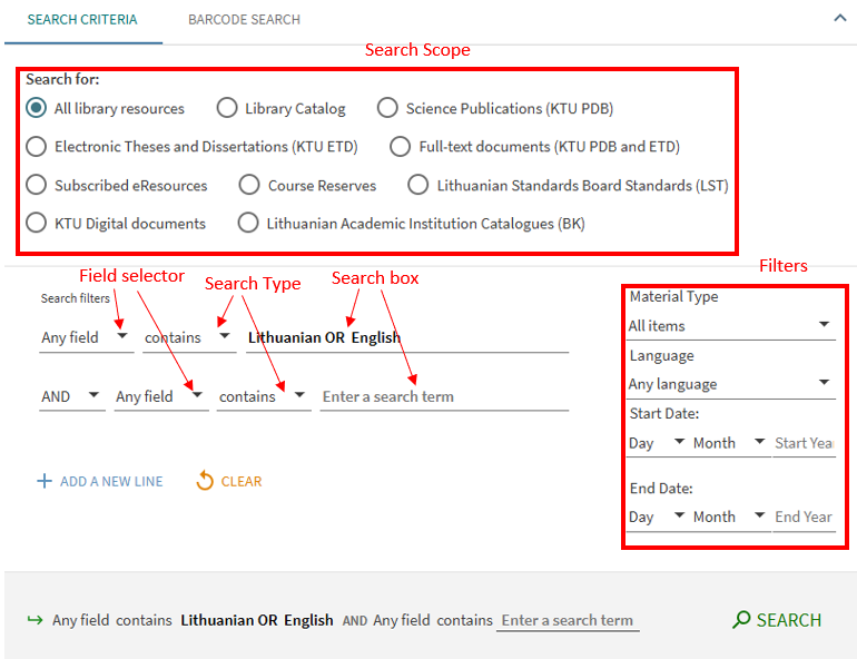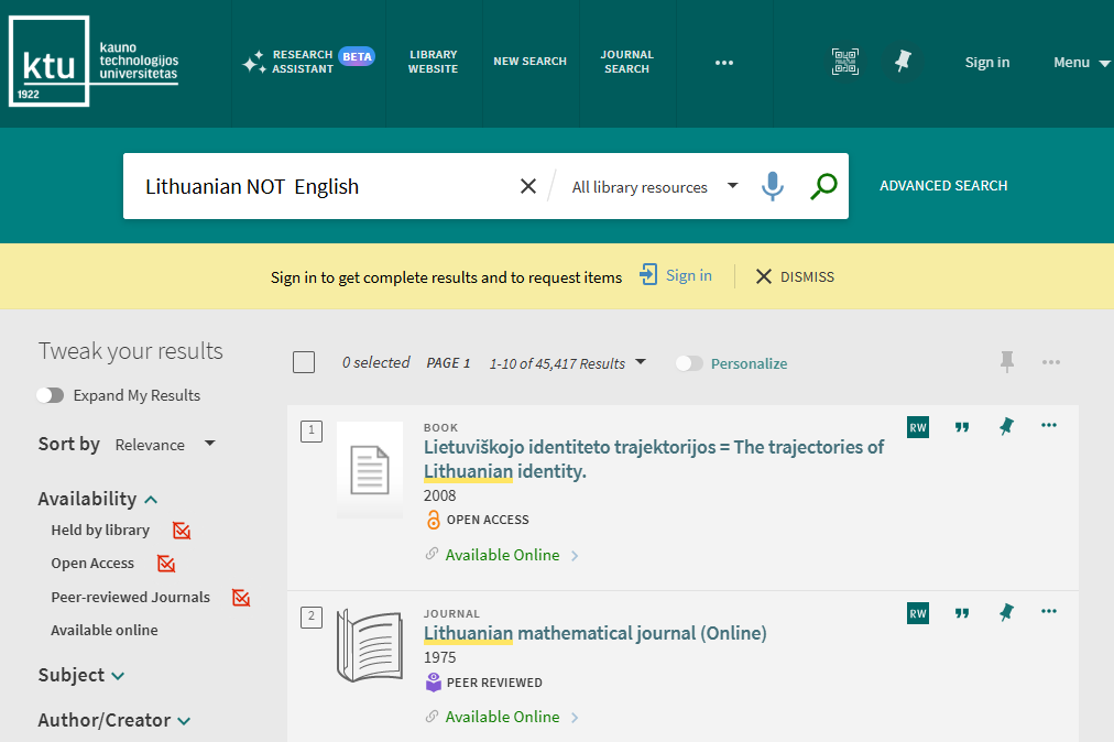 You can combine OR, AND, NOT logical search operators. Such searches can be grouped with parentheses. If the parentheses are not used, the NOT operator must be used last. For example: Lithuanian AND English NOT Russian. If it is necessary to place the NOT operator elsewhere, make sure that you enclose the operation with parentheses. For example: (Lithuanian NOT Russian) AND English.