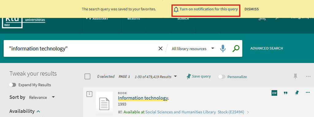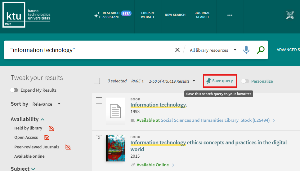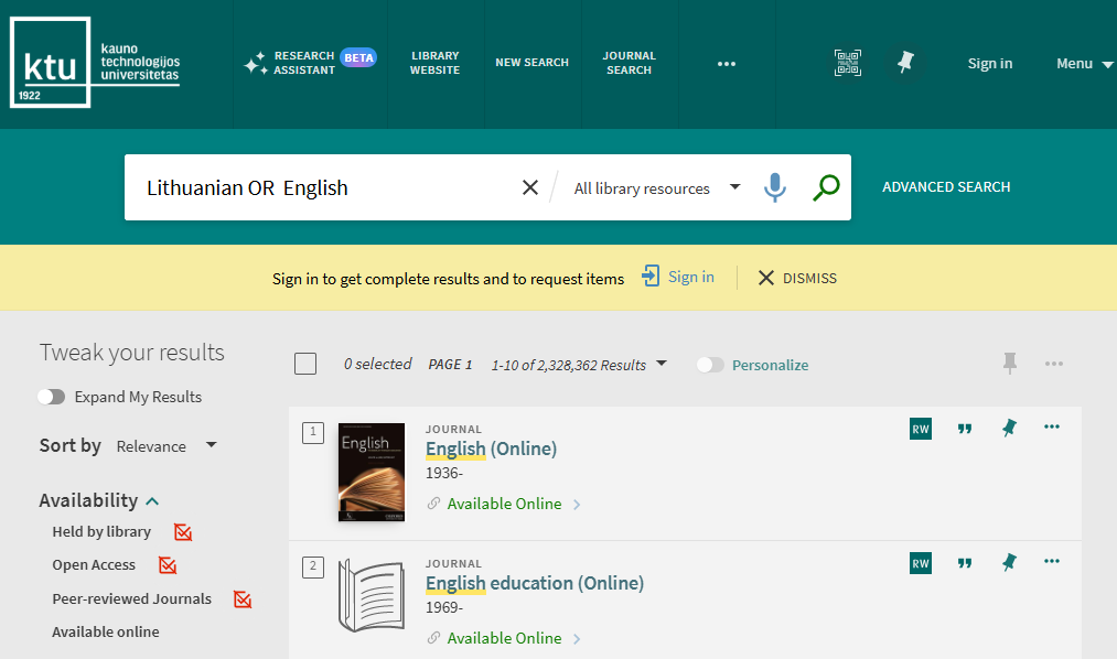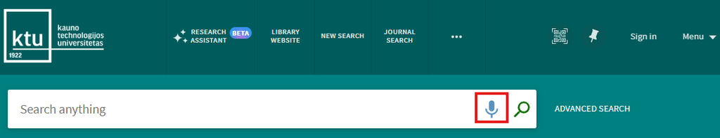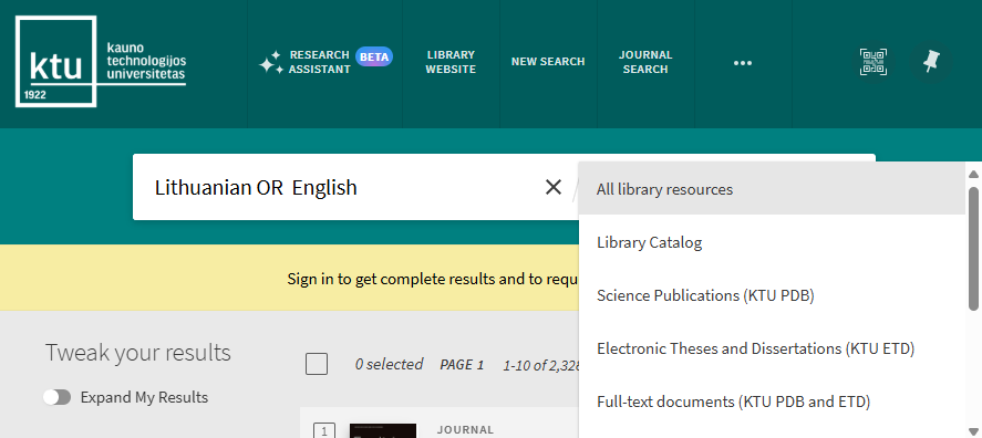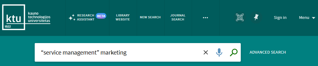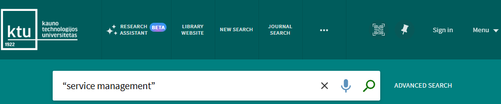 You can search very easily in KTU Virtual Library. Just type one or more search words and click the “Search” button (a magnifying glass image on the right from search words). If you enter multiple words, KTU Virtual Library will return results that contain all of the specified terms. When searching by entering ISBN and ISSN values are searched with or without hyphens. If you are not getting expected results with hyphens, please try your search again without hyphens.