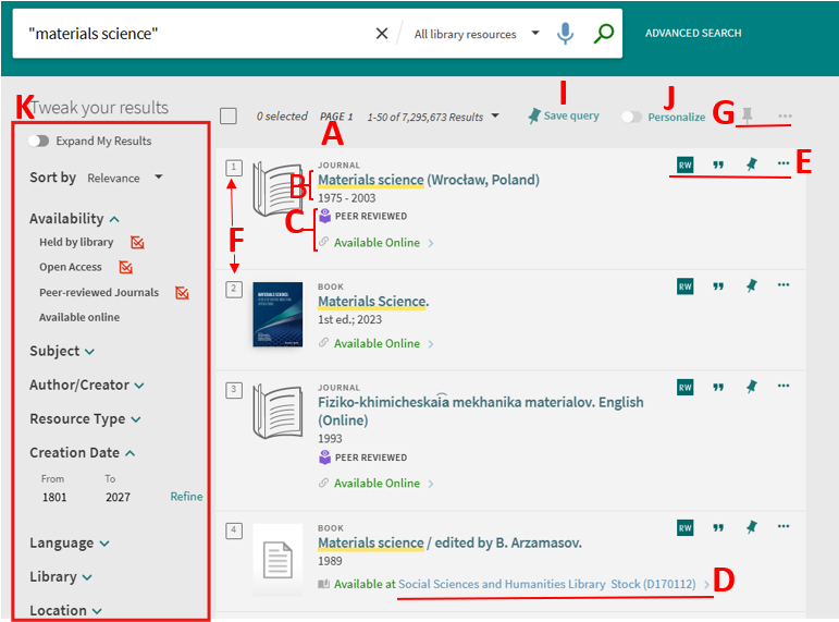 K. Tweak my results – the facets on the right side of the page allow you to filter your results by categories (such resource type and date) and to specify a type of sort. The facets are generated from the top 10 000 records by using specialized record data. Next to the facet value you will see (if applicable) the count of records that can be filtered by using that facet value. Read more Filtering the Results.