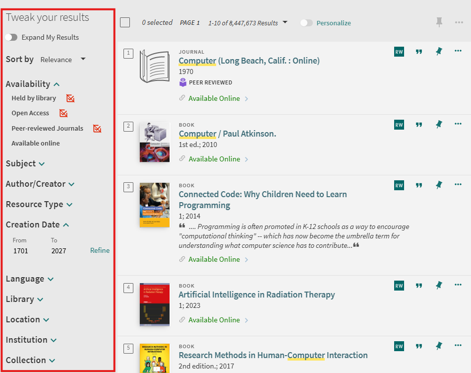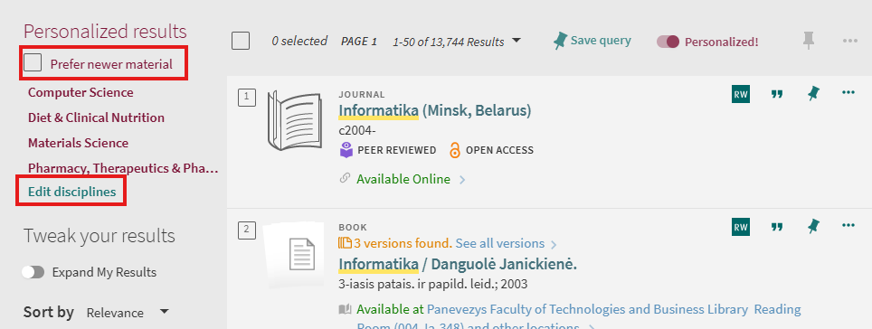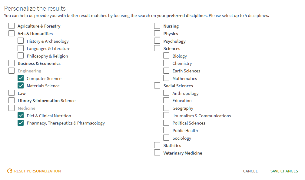 Personalized ranking in Central Discovery Index is particularly helpful for ambiguous searches, where search results come from a variety of disciplines or include a large set of articles. It does not replace topic facets or act as a filter. It simply adjusts the ranking algorithm to the general discipline of the user.