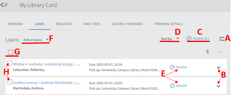 Signed in user can see his active loans, previous and historic loans and renew active loan. Loan list can be accessed from user space My Library Card (My Account) section Loans.