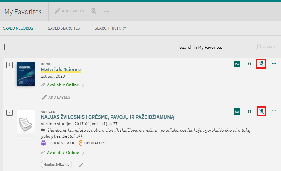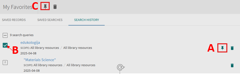 To remove an individual item from the list you can click the “Unpin” button next to the item either in the search results or on the “My Favorites > Saved Records” tab. For removing multiple items at the same time you can select needed items on the “My Favorites > Saved Records” tab and click “Remove this items”.