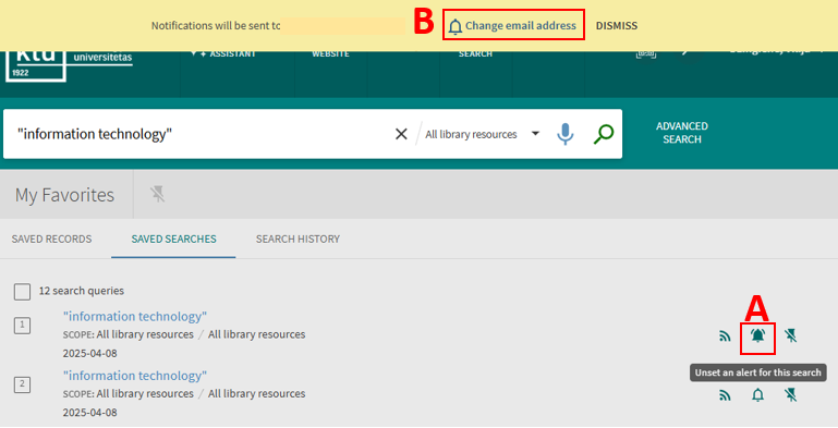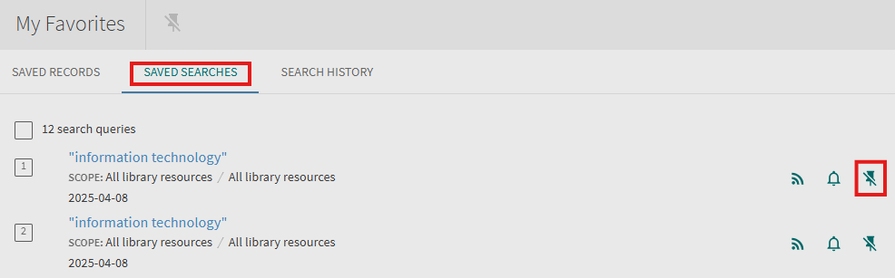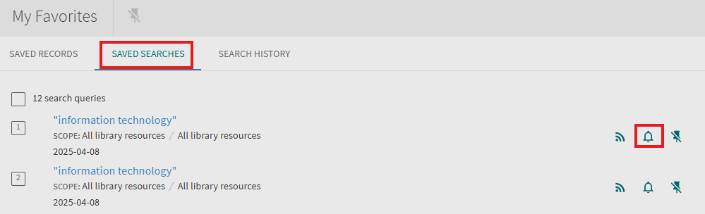 Signed-in users are allowed to receive email alerts when there is an update to the saved search query. After an alert has been set, the My Favorites > Saved Searches page allows users to perform the following operations on alerts: set/clear an alert and update email addresses.