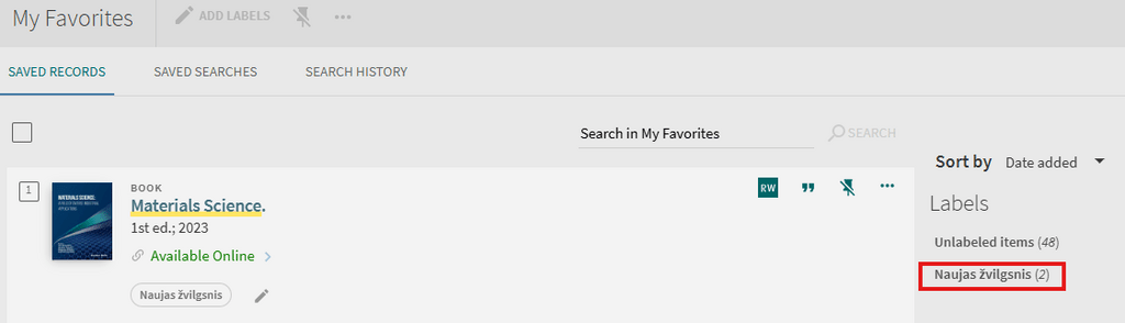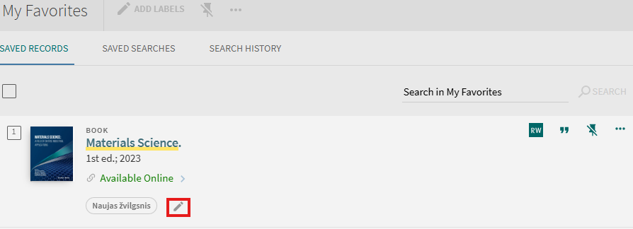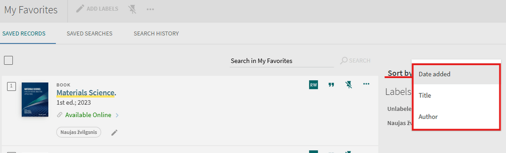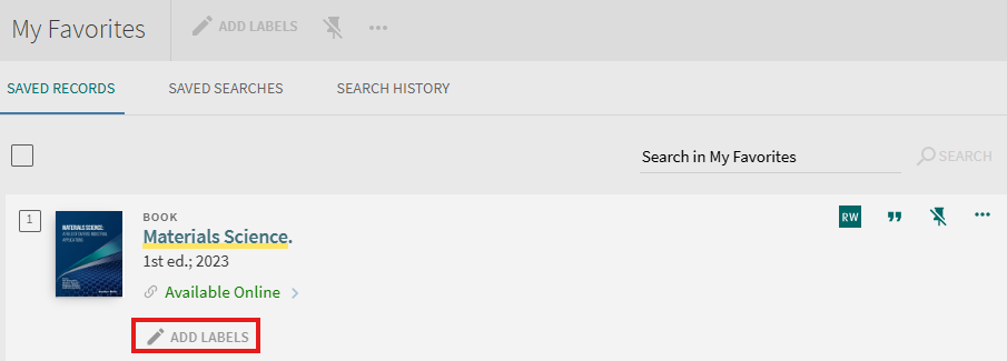 Signed-in users are able to save found records for subsequent sessions. After a record has been saved, the “My Favorites > Saved Records” page allows users to perform the following operations on saved records: view, delete, and label. Labels allow you to group and manage similar records.