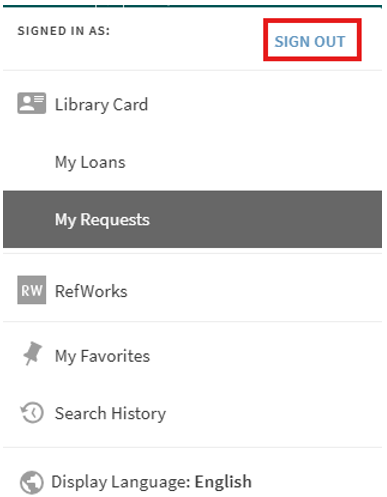 “My Library Card” is accessible by clicking the Sign-In area in the upper right corner of the screen and choosing “My Library Card” in the expanded menu.