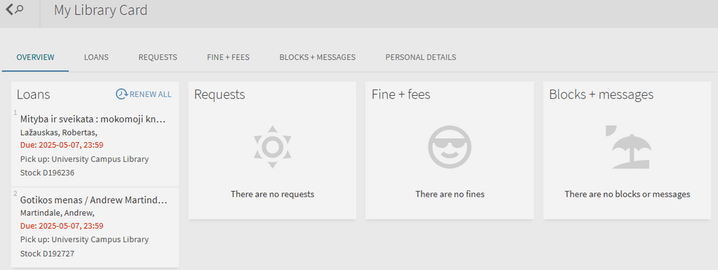With the “My Library Card” feature, you can extend the deadlines for loan items, cancel your loans, read messages the library staff posted to you, change your personal settings.